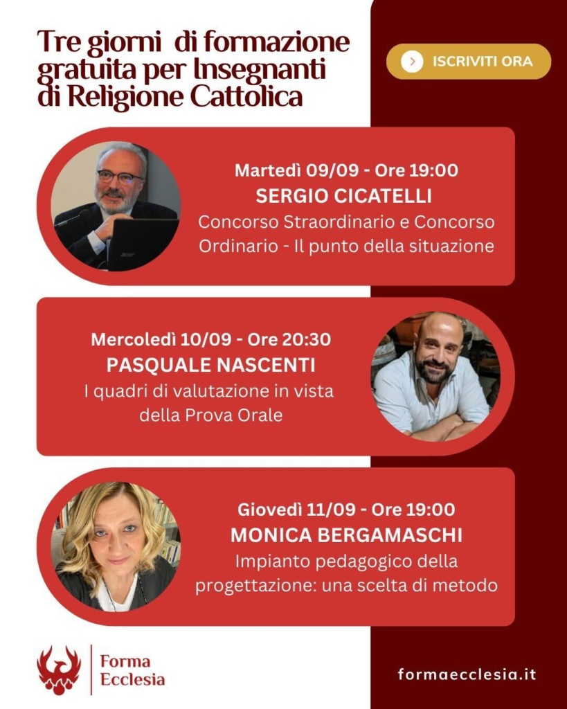 Il 9, 10 e 11 Settembre partecipa ai tre webinar gratuiti online con Sergio Cicatelli, Pasquale Nascenti e Monica Bergamaschi. Al termine di ogni webinar ci sarà un annuncio vantaggioso per i docenti che devono affrontare la prova orale del Concorso Ordinario IRC.